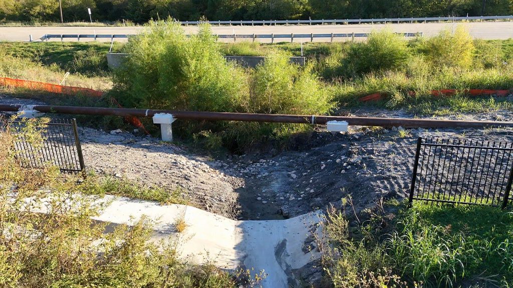 As part of our on and off-site sanitary sewer work, this four pier aerial crossing was built over a water wash that moves storm water from our site under Highway 380 to the South.This ensures flooding will not be an issue.